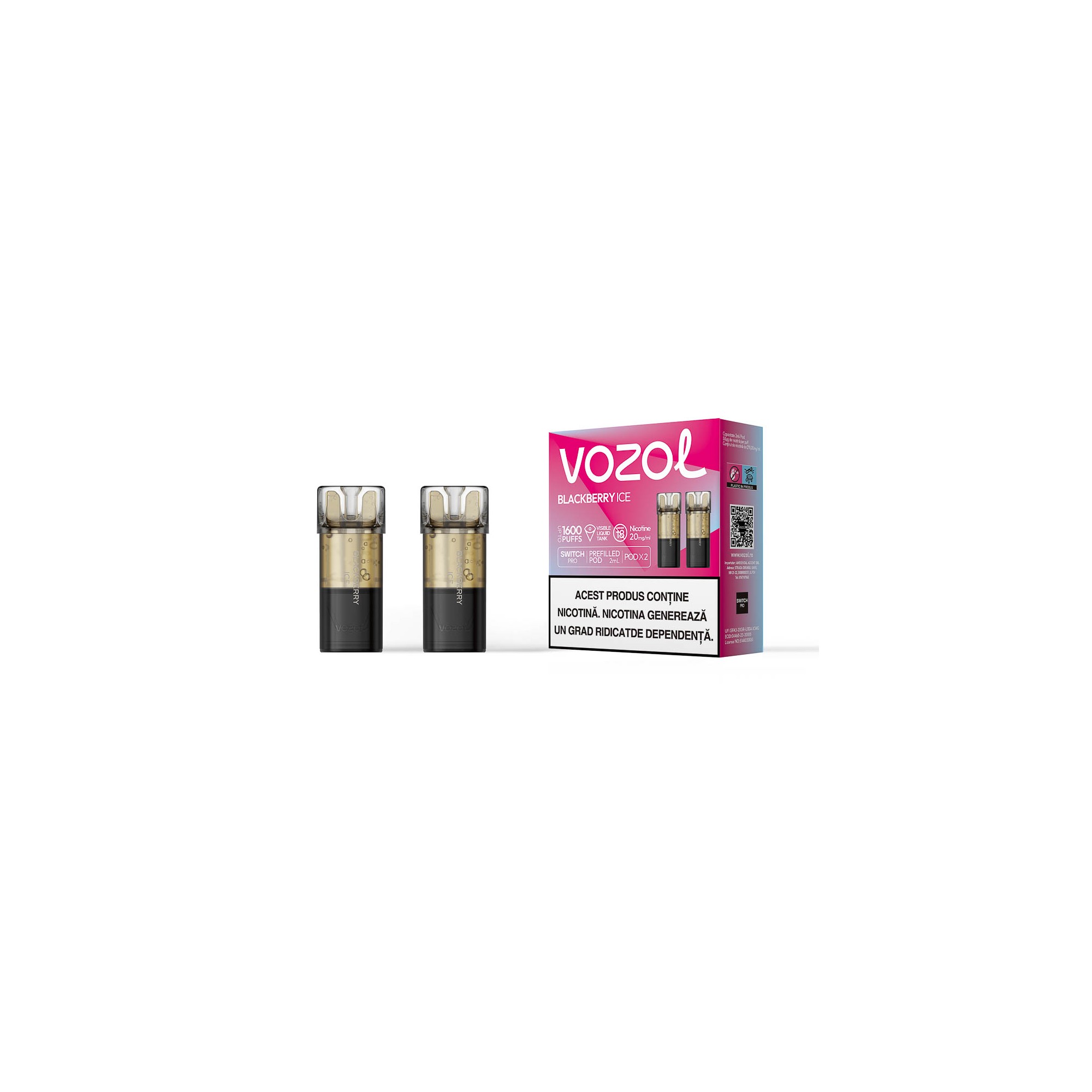 VOZOL SWITCH PRO BLACKBERRY ICE este un cartus de unica folosinta preumplut cu 2 ml de e-Lichid cu 2% nicotina suficient pentru a savura pana la 800 pufuri cu o aroma delicioasa de mure .Sistemul inovator de atomizare si mustiucul ergonomic iti ofera un confort deosebit in timp ce vapezi. Cartusele sunt special concepute pentru dispozitivele SWITCH PRO. Ingrediente:glicerina vegetala, propilen glicol, nicotina, arome naturale si artificiale. Pachetul contine: 2 cartuse SWITCH PRO BLACKBERRY ICE si instructiuni de folosire. Sistemul permite adăugarea și îndepărtarea rapidă a capsulelor magnetice, fără scurgeri